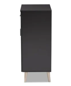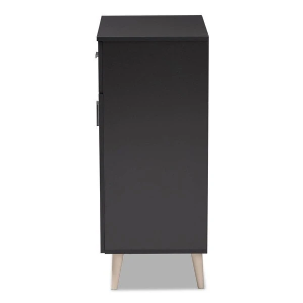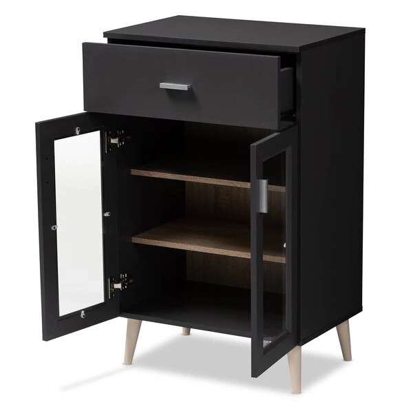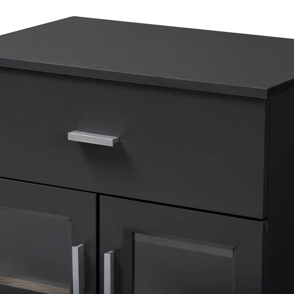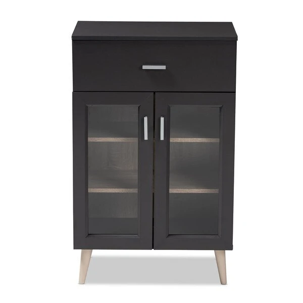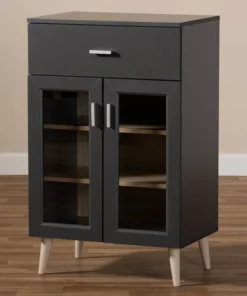You've coordinated your living room's decor and honed your bedroom's aesthetic – now you can do the same for your kitchen with the Jonas kitchen cabinet. The modern and contemporary-inspired design of the cabinet emphasizes straight lines and solid colors. The Jonas's engineered wood frame is finished in gray, with the legs and compartments finished in oak brown for a complementary, two-tone look. This kitchen cabinet features three shelf spaces behind glass paneled cabinet doors, which have tasteful, silver finished, powder-coated handles. The Jonas also features a convenient top drawer for storage, giving you a place to store utensils, table cloths, or anything in your kitchen and dining area that needs to be organized. This cabinet sits on four tapered legs, providing an under clearance area that is easier to clean. Have convenience, storage, and style in your kitchen or dining room with the Jonas kitchen cabinet. The kitchen cabinet requires assembly.