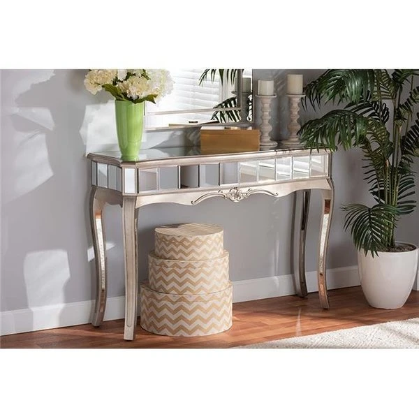 Bring lustrous appeal to the interior of your home with the dazzling design of the Elgin console table. Made in China. this table is comprised of a brushed silver finished wood frame decorated with mirrored glass accents that beautifully reflect light. Requiring assembly. the Elgin is fitted with cabriole legs that provide excellent stability while lending a graceful silhouette that stands out. Elegant molding further distinguishes the Elgin console table as a luxurious yet practical addition to any space. FeaturesConstructed from firwood and mirrored glassSilver finishDecorative moldingMirrored glass accentsCabriole legsAssembly requiredSpecificationsColor: Silver & MirrorWeight: 44.1 lbs