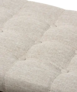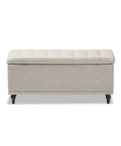 Whether paired with upholstered bed as a bed end bench or simply on its own, this modern classic button-upholstered storage ottoman offers classic and smart interiors styling with practical internal storage that will work in any room. Add an on-trend neutral accent to a simple white room, the Kaylee storage ottoman bench is upholstered in polyester fabric available in your choice of beige, greyish beige, dark grey or light blue color for a neutral or statement look. Constructed of solid rubberwood frame and feet, the Kaylee is built to last. The ottoman box opens up to reveal internal storage for blankets and bed linen. Softly padded, the top of the lid features button-tufting with grid lines while the sides are trim with silver nail heads for a modern look. For refined elegance, the detailed stitching on all sides and the classic feet complete the look. The Kaylee storage ottoman bench requires minor legs assembly