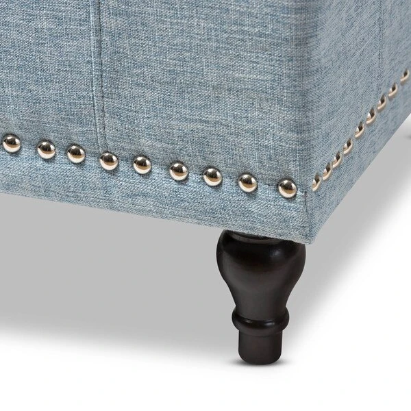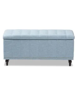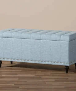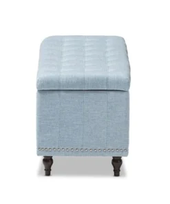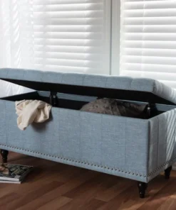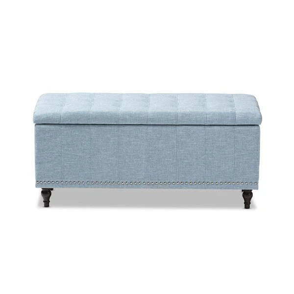 Whether paired with upholstered bed as a bed end bench or simply on its own, this modern classic button-upholstered storage ottoman offers classic and smart interiors styling with practical internal storage that will work in any room. Add an on-trend neutral accent to a simple white room, the Kaylee storage ottoman bench is upholstered in polyester fabric available in your choice of beige, greyish beige, dark grey or light blue color for a neutral or statement look. Constructed of solid rubberwood frame and feet, the Kaylee is built to last. The ottoman box opens up to reveal internal storage for blankets and bed linen. Softly padded, the top of the lid features button-tufting with grid lines while the sides are trim with silver nail heads for a modern look. For refined elegance, the detailed stitching on all sides and the classic feet complete the look. The Kaylee storage ottoman bench requires minor legs assembly