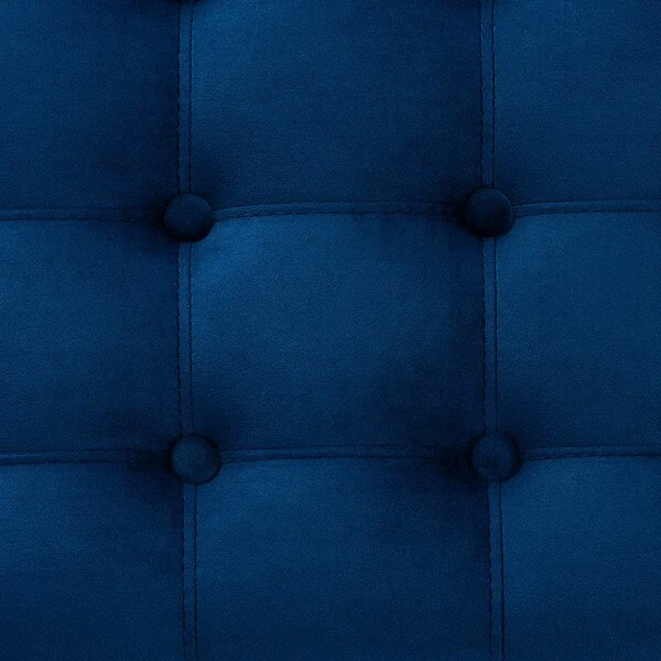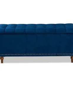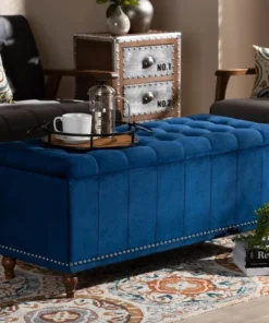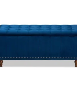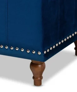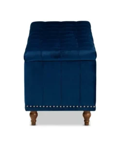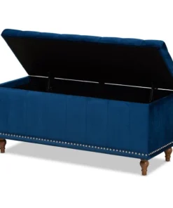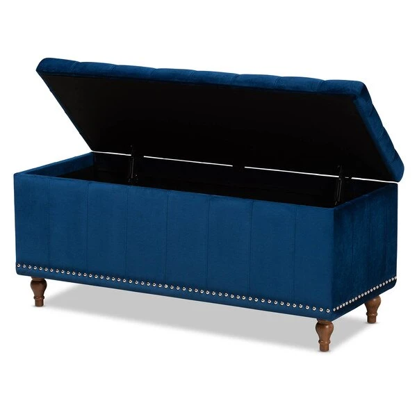 Whether placed in the bedroom or living room, the Kaylee storage bench offers elegant style and handy storage space. Constructed from rubberwood, the Kaylee is upholstered in a soft velvet fabric that adds a dose of glamour to your space. The top is foam padded for seating comfort and opens to reveal ample storage space for extra blankets and linens. Silver nail heads and grid stitching lend a modern look, while button tufting and turned feet add a refined elegance. The Kaylee storage bench requires leg assembly.