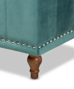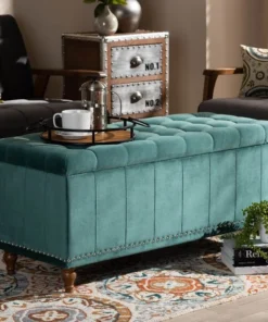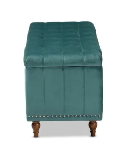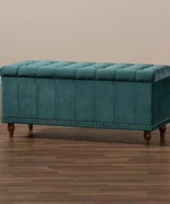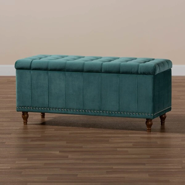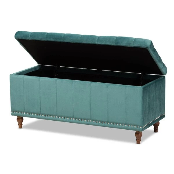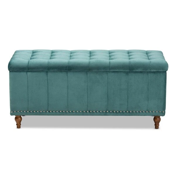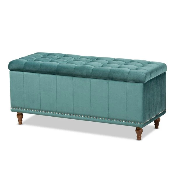 Whether placed in the bedroom or living room, the Kaylee storage bench offers elegant style and handy storage space. Constructed from rubberwood, the Kaylee is upholstered in a soft velvet fabric that adds a dose of glamour to your space. The top is foam padded for seating comfort and opens to reveal ample storage space for extra blankets and linens. Silver nail heads and grid stitching lend a modern look, while button tufting and turned feet add a refined elegance. The Kaylee storage bench requires leg assembly.