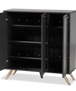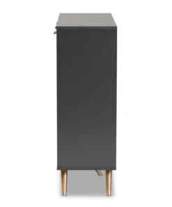 A tasteful expression of modern minimalism, the Kelson shoe cabinet is an impressive solution to entryway storage. Made in Malaysia, the sturdy wood frame of the Kelson showcases a dark grey finish that exudes a cool, contemporary character. Four spacious shelves behind the doors provide space for around 12 pairs of shoes, depending on size. Requiring assembly, the Kelson utilizes gold-tone angled legs for stable support with a luxurious touch. Gold handles add an eye-catching touch, making the Kelson shoe cabinet a refreshing addition to any space.