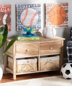 Add a touch of warmth to your interior with the natural wood tones of the Kenwood storage unit. Made in China, this unit is comprised of a lightweight wood frame fitted with woven baskets. Two drawers provide secure on-hand storage while two baskets create a convenient display for larger items. Comes fully assembled, the Kenwood utilizes fabric liners in its baskets for a charming, contemporary touch. Rounded drawer knobs complete the look, making the Kenwood storage unit a lovely addition to any space.