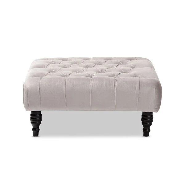 Whether used as an ottoman or coffee table, the Keswick ottoman is an upgrade for any space. Constructed from eucalyptus wood, this chic ottoman is upholstered in rich velvet upholstery that is soft to the touch. The stunning sheen of the velvet is highlighted by button tufting on top, which adds a refined touch. Black turned, fluted legs add classic appeal. The Keswick ottoman will arrive fully assembled.