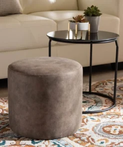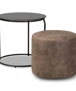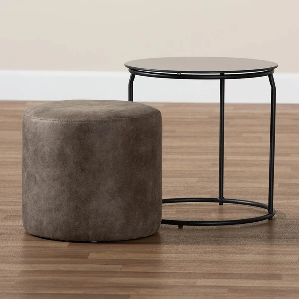 Maximize your space while maintaining a chic setup with the Kira 2-piece table and ottoman set. Constructed from metal and glass, the table features an open frame and round tabletop for a sleek, modern look. The table is accompanied by a grey and brown fabric upholstered ottoman padded with foam for the utmost comfort. This versatile piece can be used as a footstool or as extra seating for guests. When the ottoman is not in use, simply tuck it under the table to free up your space. The Kira 2-piece ottoman and table set requires assembly.