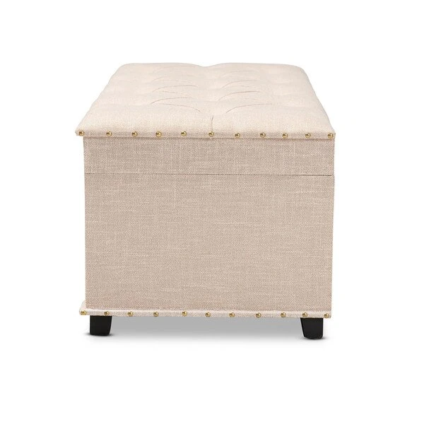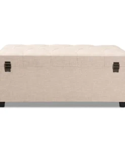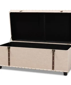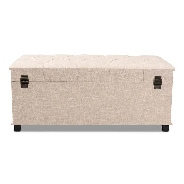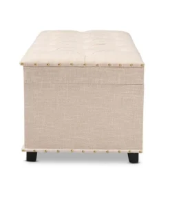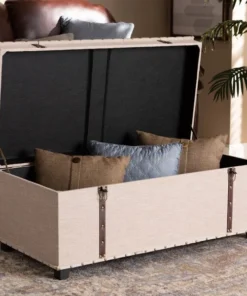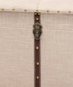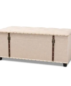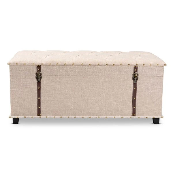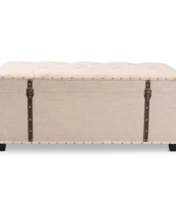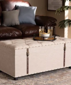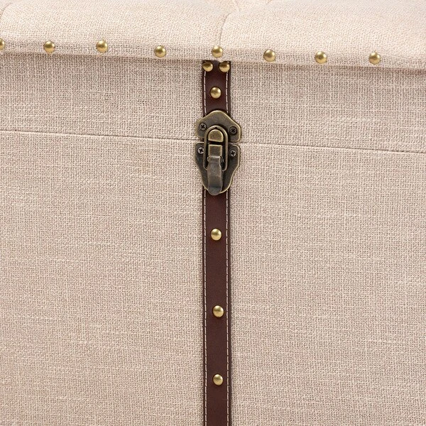 An ottoman, coffee table, and storage trunk in one, the Kyra storage ottoman adds versatility to any space. Set on top of black tapered feet, the Kyra is upholstered in an elegant linen-like fabric and features a cushioned lift-top seat that reveals ample storage space. Inspired by vintage steamer trunks, the Kyra is accented with faux leather straps and brass latches. Gold-toned nailheads and button tufting add an extra dose of style. The Kyra ottoman will arrive fully assembled.