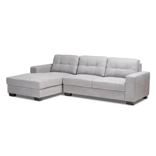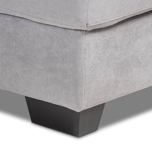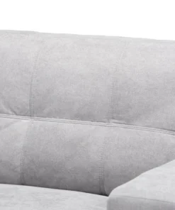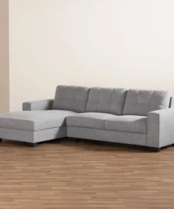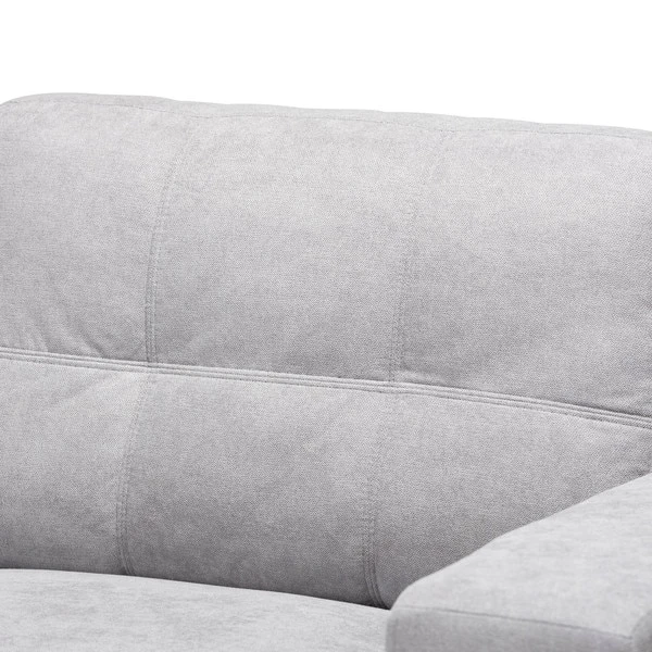 Clean lines and plush cushions give the Langley sofa contemporary appeal. Constructed from wood, the Langley is upholstered in a chic grey polyester fabric. Wide, supple cushions provide ample comfort and relaxation during movie nights. Sleek track arms and biscuit tufting lend a tailored look, while black tapered feet provide elevation for easy dusting. The Langley sofa requires assembly.