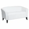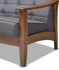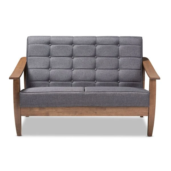 Inspired by chic mid-century Scandinavian design, the Larsen loveseat is a cool addition to any space. Constructed from solid rubberwood, the Larsen showcases a sleek silhouette comprised of sloping arms and an angled back. Wide, plush grey fabric cushions provide comfort and complement the warm walnut brown finish on the frame. Mid-century modern-inspired details, such as biscuit tufting and tapered legs, give the Larsen a vintage charm that recalls of a simpler time. Stylish and versatile, the Larsen is well suited for both private living spaces and public reception areas. The Larsen loveseat requires assembly.