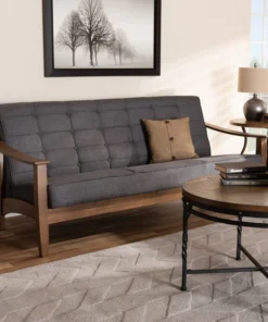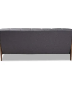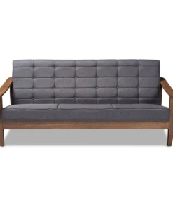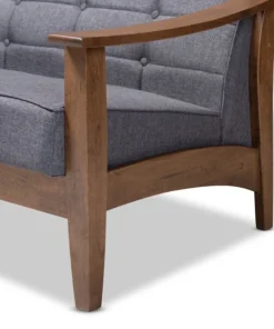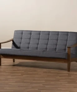 Inspired by chic mid-century Scandinavian design, the Larsen sofa is a cool addition to any space. Constructed from solid rubberwood, the Larsen showcases a sleek silhouette comprised of sloping arms and an angled back. Wide, plush grey fabric cushions provide comfort and complement the warm walnut brown finish on the frame. Mid-century modern-inspired details, such as biscuit tufting and tapered legs, give the Larsen a vintage charm that recalls of a simpler time. Stylish and versatile, the Larsen is well suited for both private living spaces and public reception areas. The Larsen sofa requires assembly.