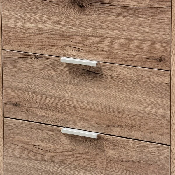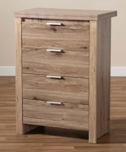 The Laverne 4-drawer chest is an essential piece of furniture that is both charming and simple. The modern and contemporary-inspired design is exemplified in the rectangular, geometric silhouette. The Laverne is finished in a natural oak brown to give you a hint of rustic and natural vibes. The chest features convenient top side drawer pulls on each of the four drawers, which roll out smoothly on slides. The minimalist chest, with its neutral coloring, will be easy to coordinate with the decor in your bedroom or guest room. The Laverne can even serve as additional storage in your entryway, living room, or closet. The chest requires assembly.