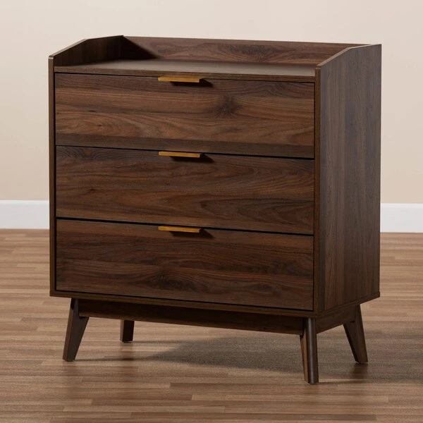 Rich wood tones are paired with a retro silhouette in the Lena chest. Constructed from engineered wood, the Lena displays an elegant walnut brown finish that complements any color scheme. Three drawers present ample space to store clothes, linens, and more. Each drawer is fitted with metal glides for smooth movement, as well as a gold-tone metal handle for a touch of refinement. Angled, tapered legs showcase the iconic mid-century look. The Lena chest requires assembly.