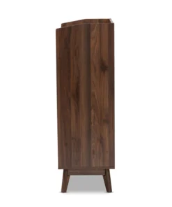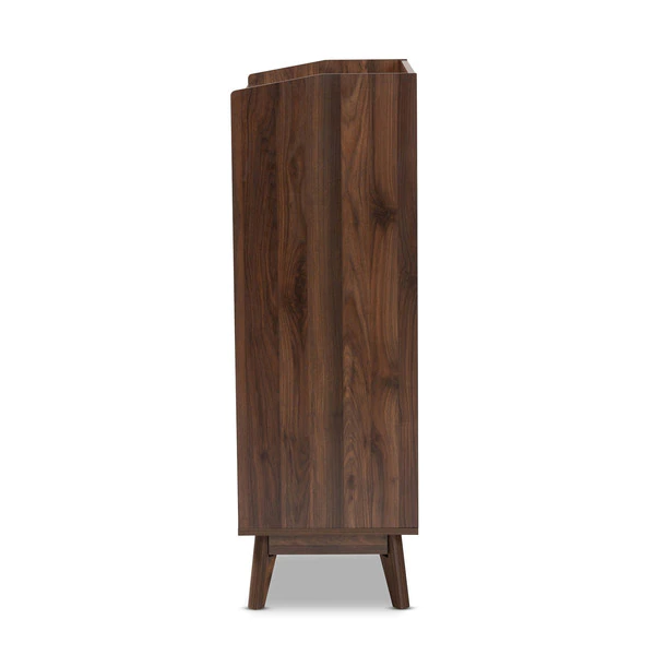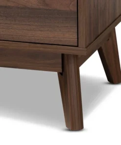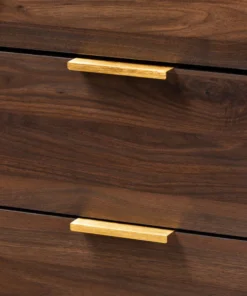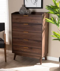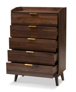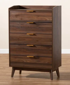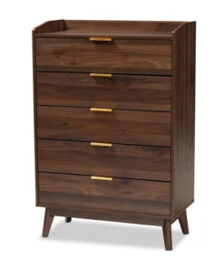 Rich wood tones are paired with a retro silhouette in the Lena chest. Constructed from engineered wood, the Lena displays an elegant walnut brown finish that complements any color scheme. Five drawers present ample space to store clothes, linens, and more. Each drawer is fitted with metal glides for smooth movement, as well as a gold-tone metal handle for a touch of refinement. Angled, tapered legs showcase the iconic mid-century look. The Lena chest requires assembly.
