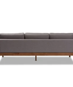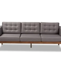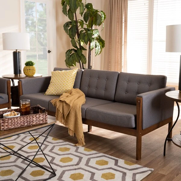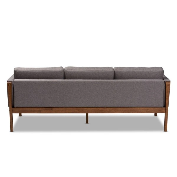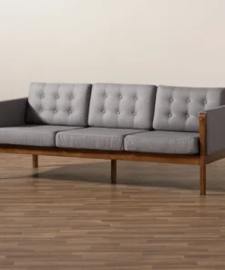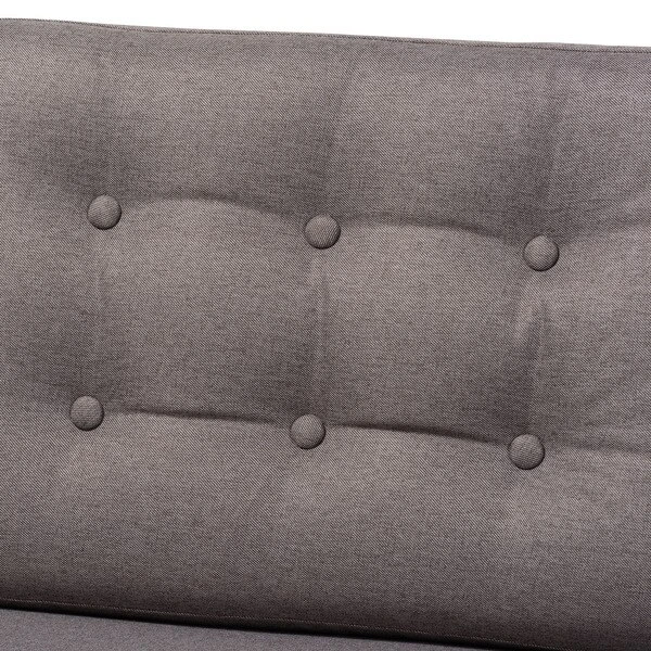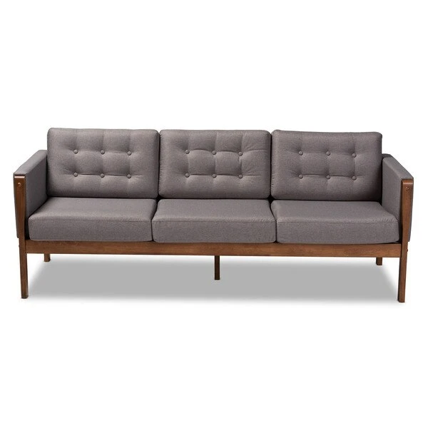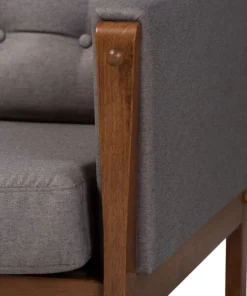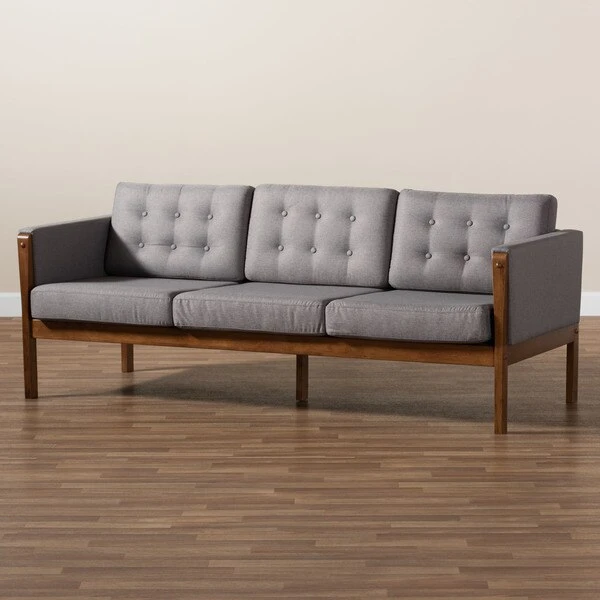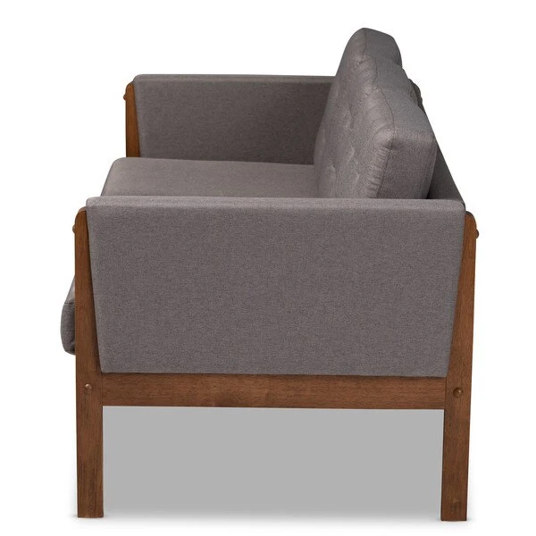 With its retro silhouette and plush cushions, the Lenne sofa unites style and comfort. Built from sturdy wood, the Lenne is upholstered in a soft grey polyester fabric that complements the walnut brown finish on the wood. This mid-century inspired piece features a clean, tailored profile elevated by rows of button tufting on the back cushions. The Lenne is well suited for both private residences and public reception spaces. The Lenne sofa requires assembly.