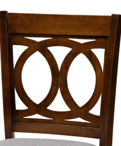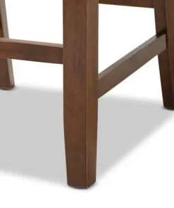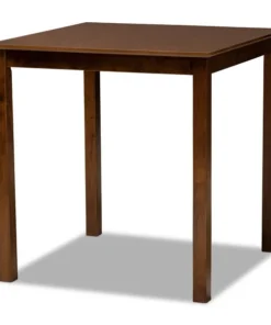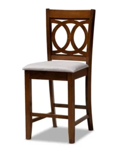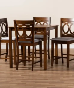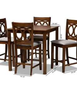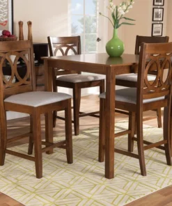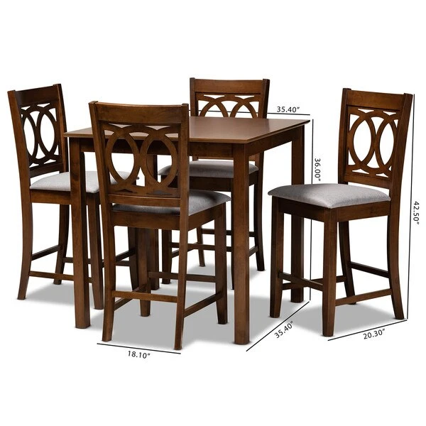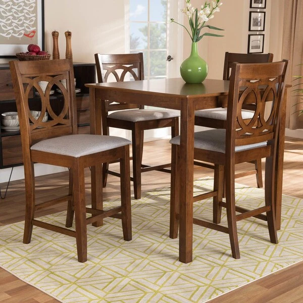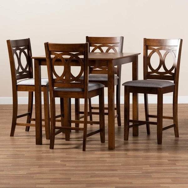 Exquisitely crafted, the Lenoir pub set adds elegance to any dining space. This wooden pub set includes one table and four chairs, each upholstered in a light fabric that complements the walnut brown finish on the wood. Designed with both comfort and style in mind, each chair features a plush foam-padded seat, as well as an exquisite cut-out design on its back. Tapered feet add a classic, refined touch. Requiring assembly, this compact dining set is well suited for dining rooms and kitchens with limited space.