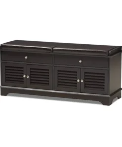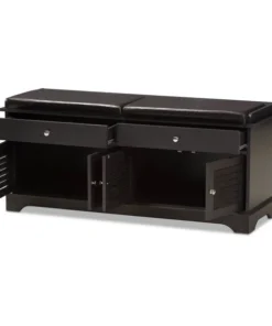 The clean lines on this robust shoe storage cabinet mean that it'll effortlessly blend into any entryway and really help clear your space of those messy piles of shoes that everyone always trips over. Constructed of engineered wood in dark brown wood veneer, the set of two doors on each side reveal organization space that can fit multiple pairs of adult shoes. To add practicality, the top of the bench is upholstered in dark brown faux leather as a cushioned seat. The Leo shoe storage cabinet bench provides ventilated air through the slats to stop the shoe odors that can often build up inside. For a modern look, silver hardware is added to ease every day's use. The shoe cabinet requires assembly.