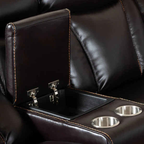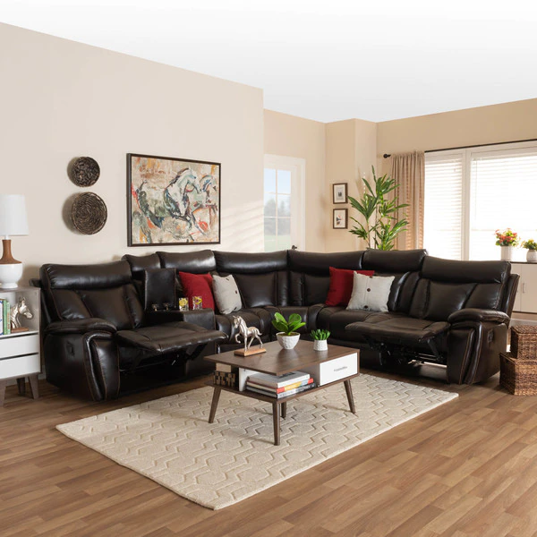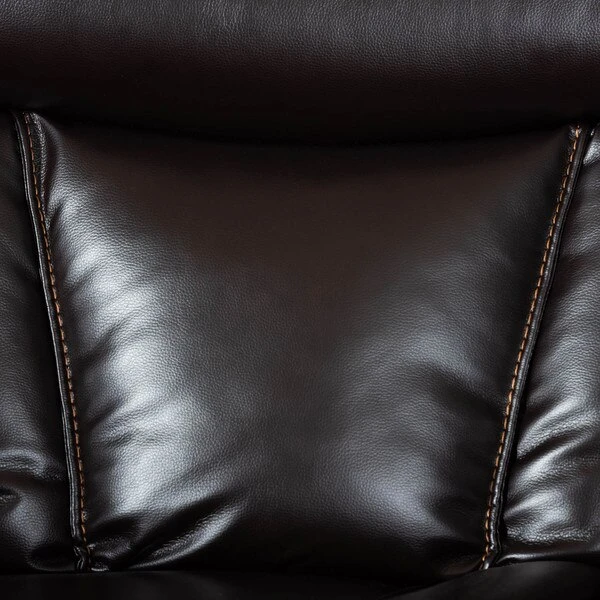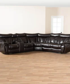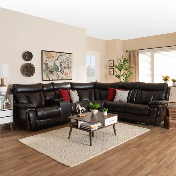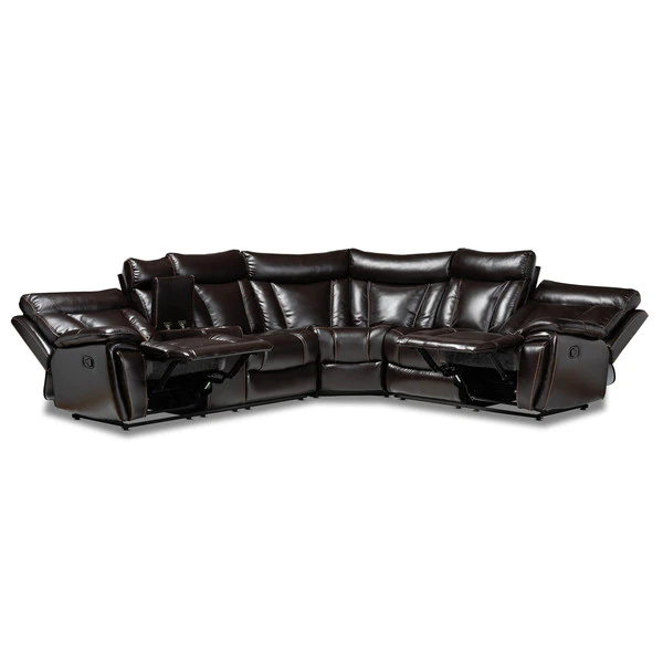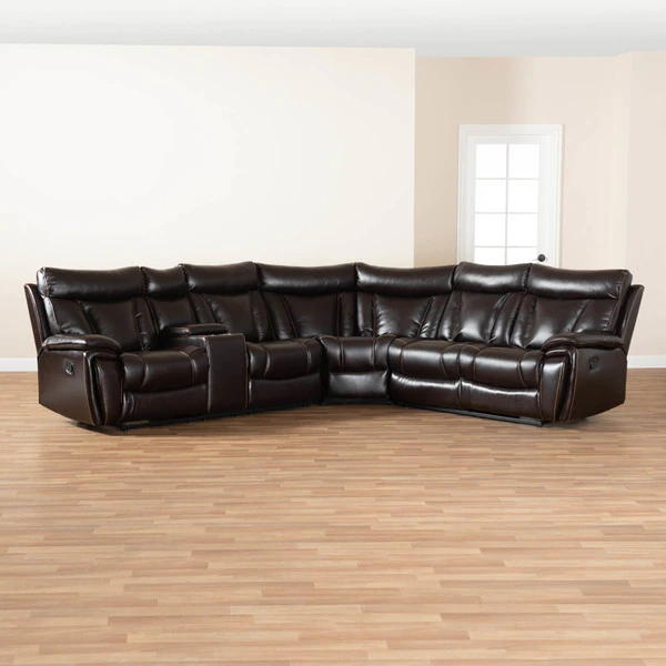 Hosting the crew for game days is easy with the Lewis sectional. This sectional includes two armless chairs, one corner wedge, and two armchairs equipped with manual recline capability. The sectional also features a console fitted with two beverage holders and a lift-top storage compartment so you can enjoy your favorite snacks and drinks as you unwind. Constructed from wood, the Lewis is upholstered in a sleek dark brown faux leather and padded with foam for plush comfort. Contrast stitching adds a cool, contemporary look. The Lewis sectional requires assembly.