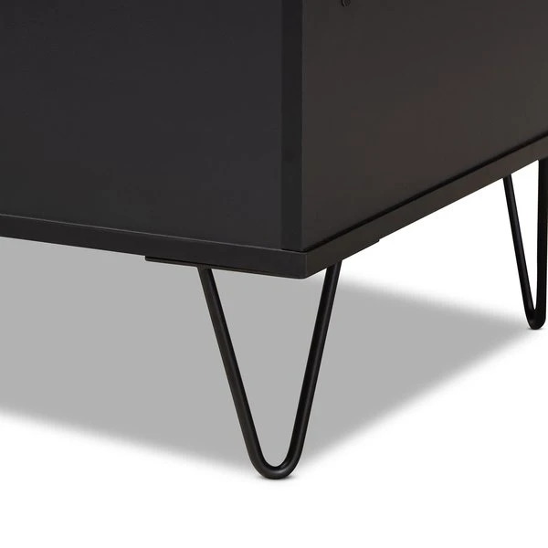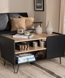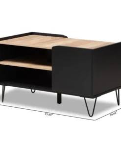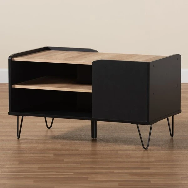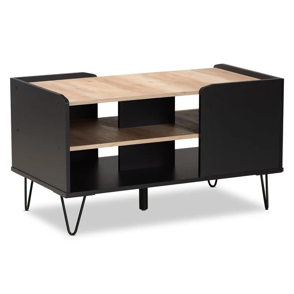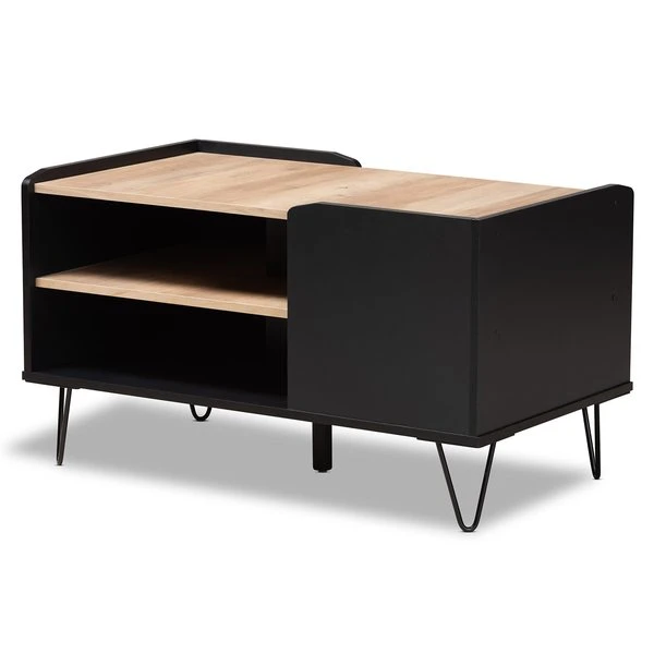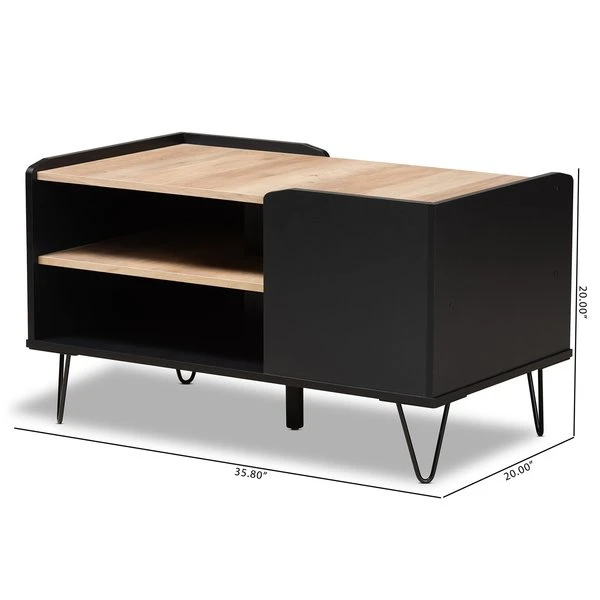 With a sleek, contemporary design, the Lilith coffee table adds a modern touch to any space. Made in Malaysia, the Lilith is comprised of sturdy wood showcasing a two-tone finish of black and oak brown. Two tiers of shelves provide ample storage capability in unique fashion, while the tabletop can remain clear for daily use. Requiring assembly, the Lilith is supported by black finished metal hairpin legs for a minimalist feel. Providing excellent storage with unique visual design, the Lilith coffee table adds modern character to any space.