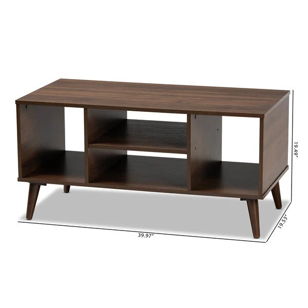 Add a dose of retro charm to your living space with the Linas coffee table. This wood coffee table features a spacious tabletop, perfect for a potted plant and a cup of espresso. Four open shelves provide ample space to display magazines, books, and more. Its walnut brown finish and angled legs add a cool, mid-century feel. The Linas coffee table requires assembly.