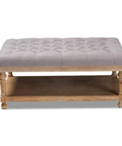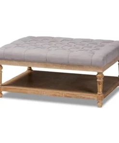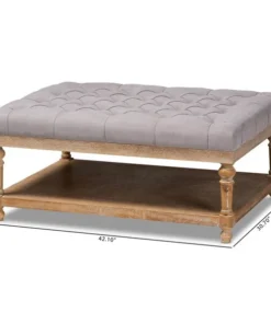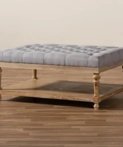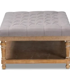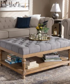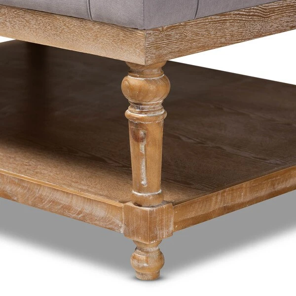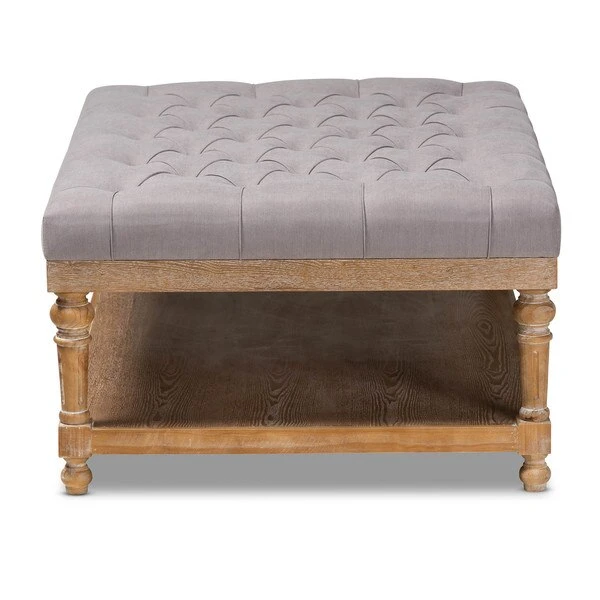Add a touch of sophisticated grace to your home with the Lindsey ottoman. The Lindsey is fitted with a lower storage shelf made out of greywashed wood to hold books, movies, or decorations. Padded with foam for the utmost comfort, the Lindsey is upholstered in linen fabric and enhanced with elegant button tufting. Excellent craftmanship adds a weathered feel to the piece, giving the ottoman a hint of rustic charm. The Lindsey requires assembly and is the perfect accent in rooms with open space. Spruce up any modern living room with the stylish utility found in the Lindsey ottoman.