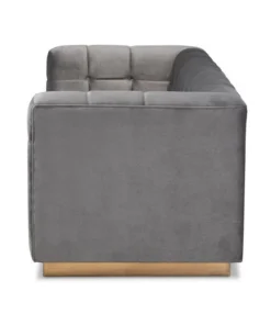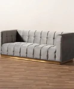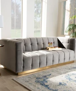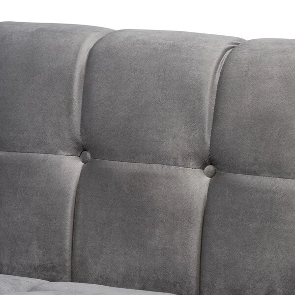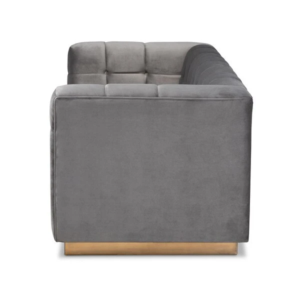 Unwind in luxury with the Loreto sofa. Featuring clean lines, the Loreto is upholstered in a rich velvet fabric that feels exceptionally soft to the touch. Elaborate button tufting is coupled with channel tufting to accentuate the stunning sheen in the velvet and lend lavish appeal. A striking antique gold finished base anchors the glamorous look of this sofa. Equal parts stylish and comfortable, the Loreto is padded with foam for the utmost sitting comfort. The Loreto sofa will arrive fully assembled.