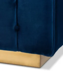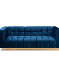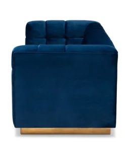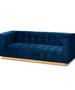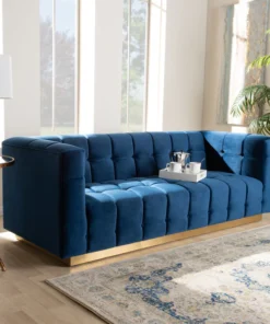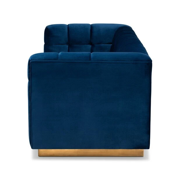 Unwind in luxury with the Loreto sofa. Featuring clean lines, the Loreto is upholstered in a rich velvet fabric that feels exceptionally soft to the touch. Elaborate button tufting is coupled with channel tufting to accentuate the stunning sheen in the velvet and lend lavish appeal. A striking antique gold finished base anchors the glamorous look of this sofa. Equal parts stylish and comfortable, the Loreto is padded with foam for the utmost sitting comfort. The Loreto sofa will arrive fully assembled.