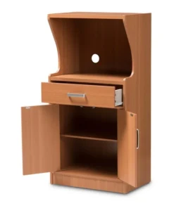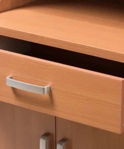 The Lowell kitchen cabinet is the simple, stylish organization solution you've been looking for. The modern and contemporary-inspired design is evident in the rectangular silhouette and subtle grooved features. The Lowell has an all over brown wood finish, with silver-finished door and drawer handles. The cabinet features two shelf spaces behind discreet doors, with a drawer on top of them for additional storage. The Lowell's top compartment has ample space for a microwave, with a cut-out in the back panel for wire management. The Lowell can provide storage for utensils, dishware, cookbooks – or anything else that needs tidying up in your kitchen or dining room. The kitchen cabinet requires assembly.