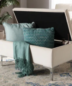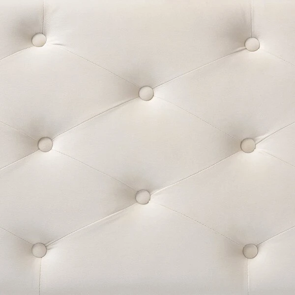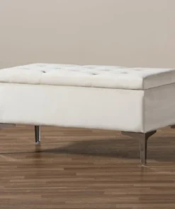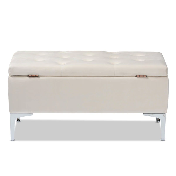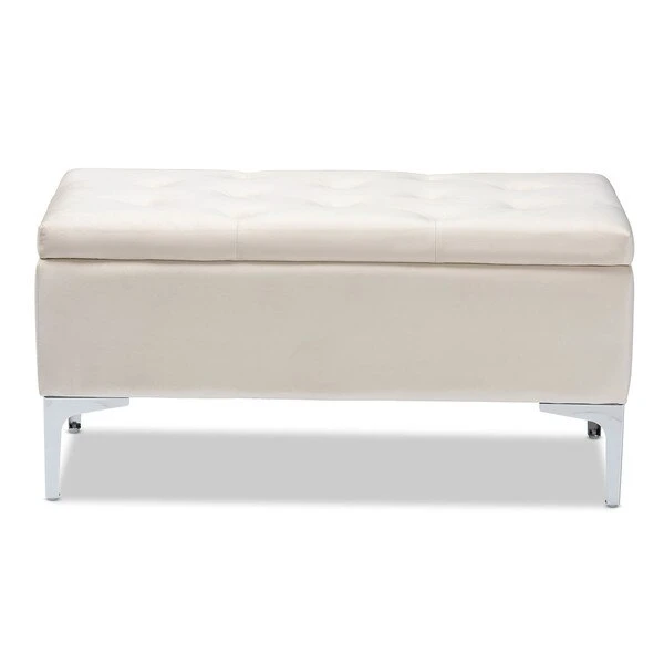 Accommodate your living room needs with the functional utility and luxurious style of the Mabel ottoman. The Mabel features elaborate button tufting for a touch of modern style. Padded with foam underneath a layer of lavish velvet, this piece is soft to the touch and designed to maximize comfort. The Mabel requires assembly and is raised to a practical height by four silver metal legs at each corner. This versatile piece can be used as a footrest or as extra seating, all while acting as a storage cabinet for busy areas.