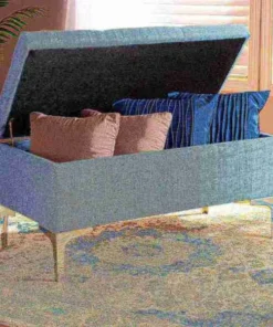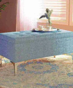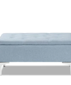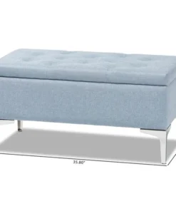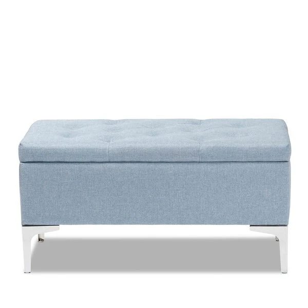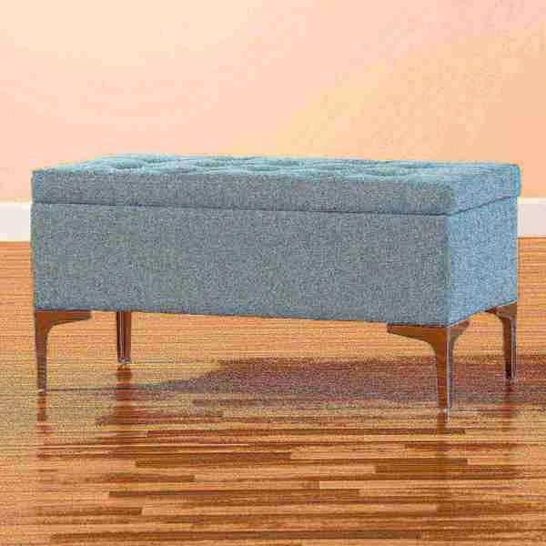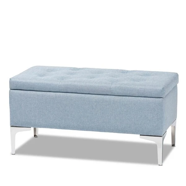 Accommodate your living room needs with the functional utility and luxurious style of the Mabel ottoman. Made in China, the cushioned lift-top seat opens to reveal ample storage space. Padded with foam underneath a layer of soft linen like fabric, this piece is soft to the touch and designed to maximize comfort. Elaborate button tufting adds a hint of modern style. Requiring assembly, the Mabel is raised to a practical height by four silver metal legs at each corner. This versatile piece can be used as a footrest or as extra seating, all while acting as a storage cabinet for busy areas.