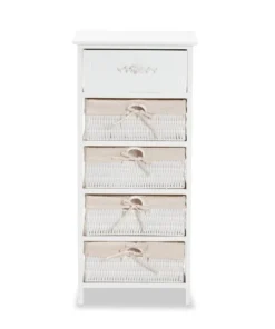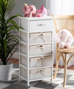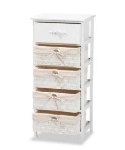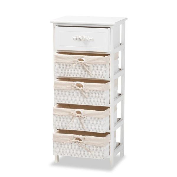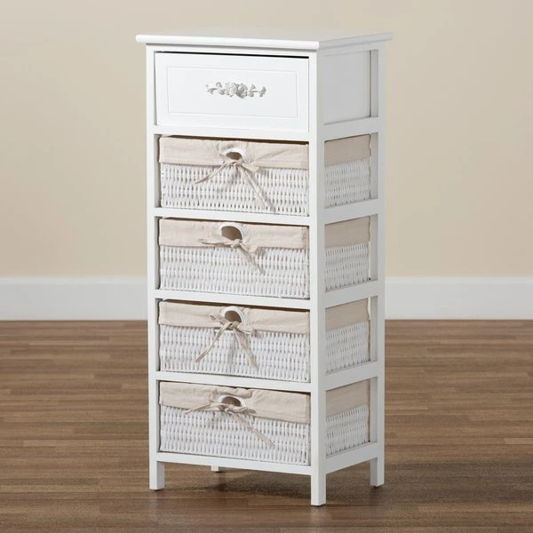 Charming with convenient utility, the Madelia storage unit adds an elegant accent to your space. Made in China, this handy piece is comprised of a sturdy wood frame fitted with baskets. One drawer adorned with a lovely molded handle and four baskets provide ample room to organize and declutter your interior. Comes fully assembled, the Madelia features fabric basket liners for an elegant, contemporary feel. A visually stunning and efficient addition, the Madelia storage unit elevates the character of any space.