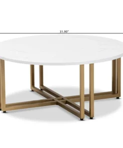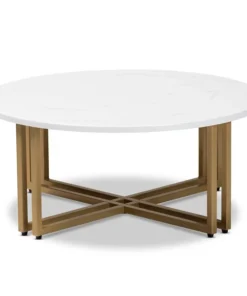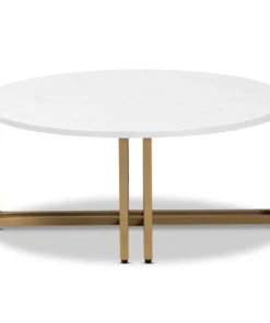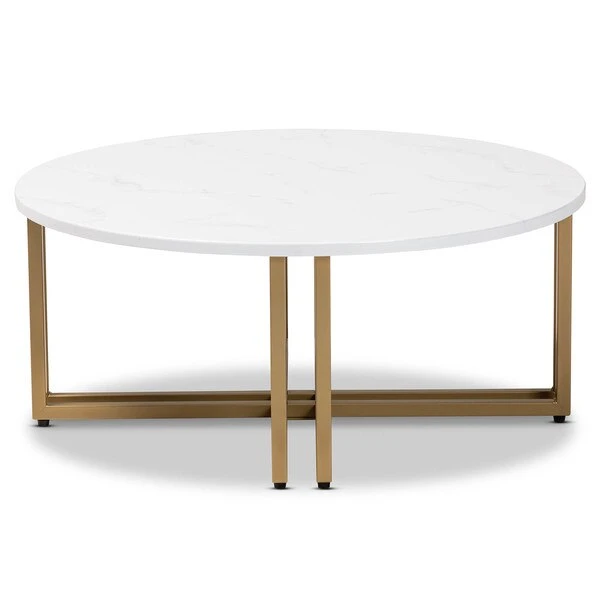 Cultivate an air of luxury in your space with the Maeve coffee table. The Maeve is comprised of a brushed gold metal frame fitted and a circular faux marble tabletop. The x-cross base lends visual interest and conveys a light, airy feel. Requiring assembly, the Maeve is fitted with black non-marking feet for easy transport and rearrangement. The stunning contrast of materials allow the Maeve coffee table to easily become the centerpiece of any space.