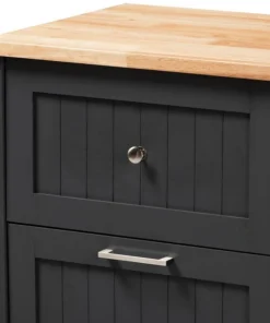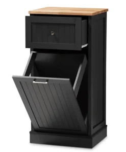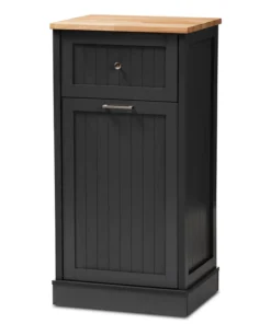 The Marcel kitchen cabinet is the simple solution you've been needing to maximize your kitchen and dining room space. The Marcel's clean, simple coastal and farmhouse-inspired design will add charm to any kitchen and dining area. The oak-finished, thick wooden top offers a convenient prep and serving surface, or a place to keep a microwave or other kitchen appliances. The Marcel features a drawer for storage and a delightfully paneled pull out garbage compartment for even more convenience. The paneled design continues on each side of the cabinet, as well as the face of the drawer. The Marcel's drawer knob and compartment handle are finished in chrome, complementing the colors of the cabinet. The dark grey finished engineered wood frame makes this charming kitchen cabinet a breeze to coordinate with your existing kitchen and dining room decor. The Marcel requires assembly.