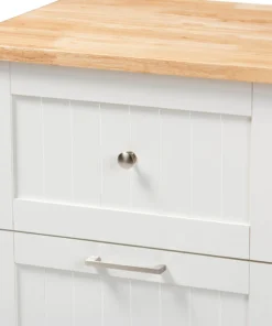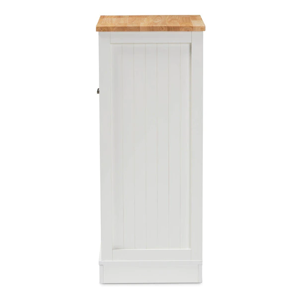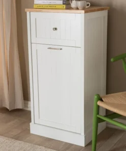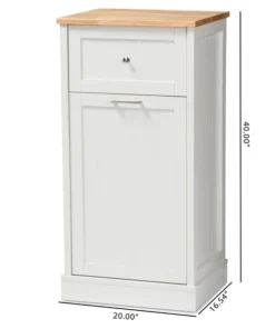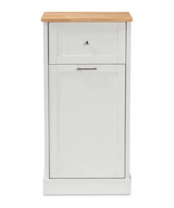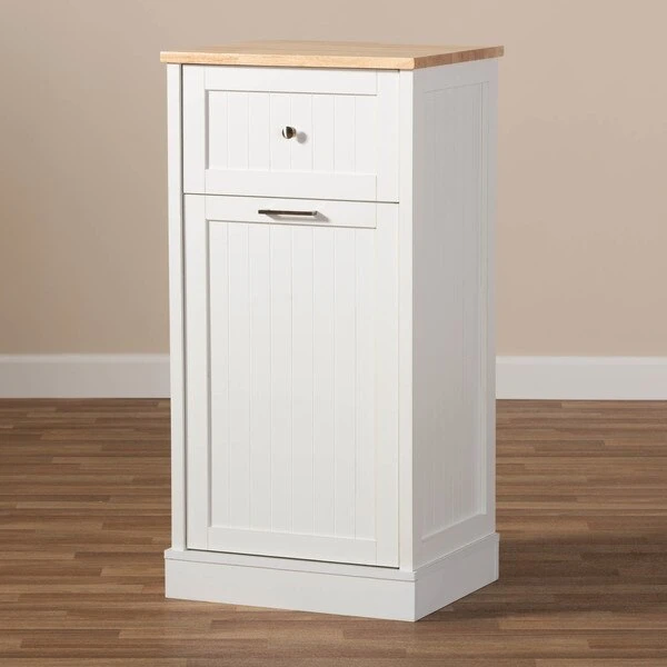 The Marcel kitchen cabinet is the simple solution you've been needing to maximize your kitchen and dining room space. The Marcel's clean, simple coastal and farmhouse-inspired design will add charm to any kitchen and dining area. The oak-finished, thick wooden top offers a convenient prep and serving surface, or a place to keep a microwave or other kitchen appliances. The Marcel features a drawer for storage and a delightfully paneled pull out garbage compartment for even more convenience. The paneled design continues on each side of the cabinet, as well as the face of the drawer. The Marcel's drawer knob and compartment handle are finished in chrome, complementing the colors of the cabinet. The white finished engineered wood frame makes this charming kitchen cabinet a breeze to coordinate with your existing kitchen and dining room decor. The Marcel requires assembly.