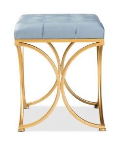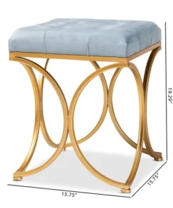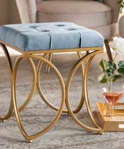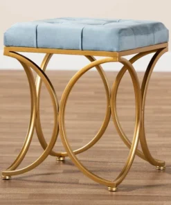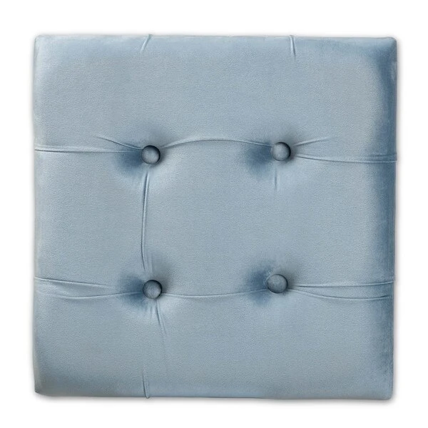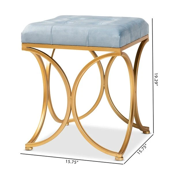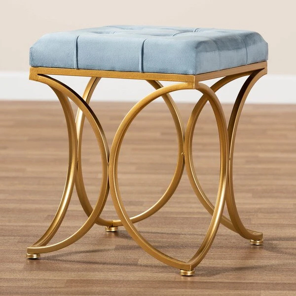 Bring the glamour of the 1920s to your space with the Margot ottoman. This metal ottoman features a striking gold-toned geometric base that provides a light, airy feel. The seat is upholstered in a rich light blue velvet fabric and is button tufted to highlight the stunning sheen in the velvet. Use this glamorous ottoman as a vanity seat or as a footstool. The Margot ottoman will arrive fully assembled.