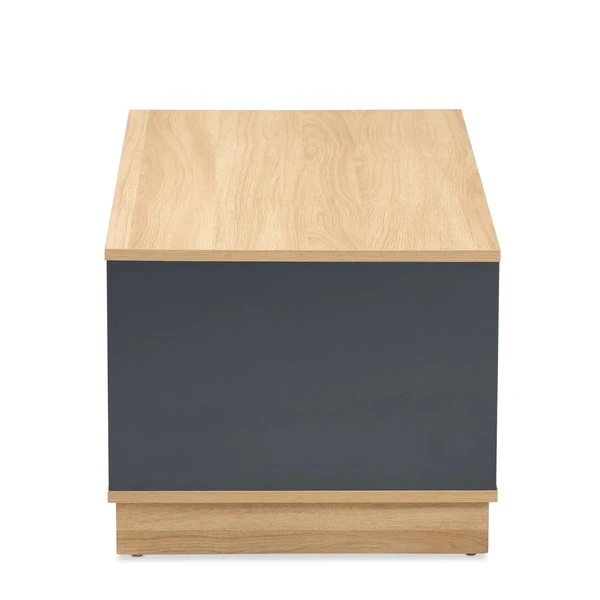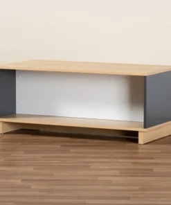A sleek, contemporary design, the Marigold coffee table modernizes any space. Made in Malaysia, this wooden table features a multi-color finish of oak brown, grey, and white for a cool, modern look. Each side of the table is fitted with a shelf to provide space to display books, magazines, and more. Requiring assembly, the rectangular tabletop provides ample surface area for meals, decorations, and general use. A uniquely modern piece built with versatility in mind, the Marigold coffee table enhances any home.