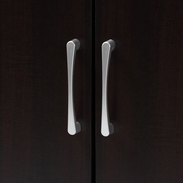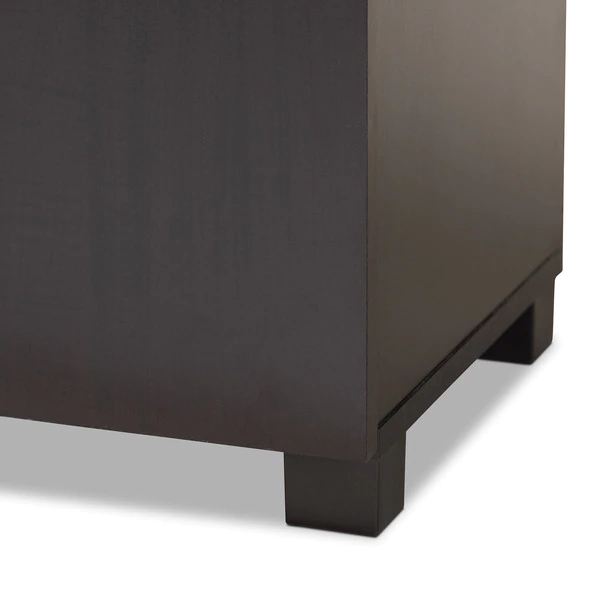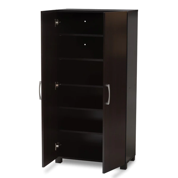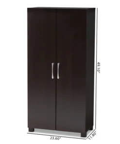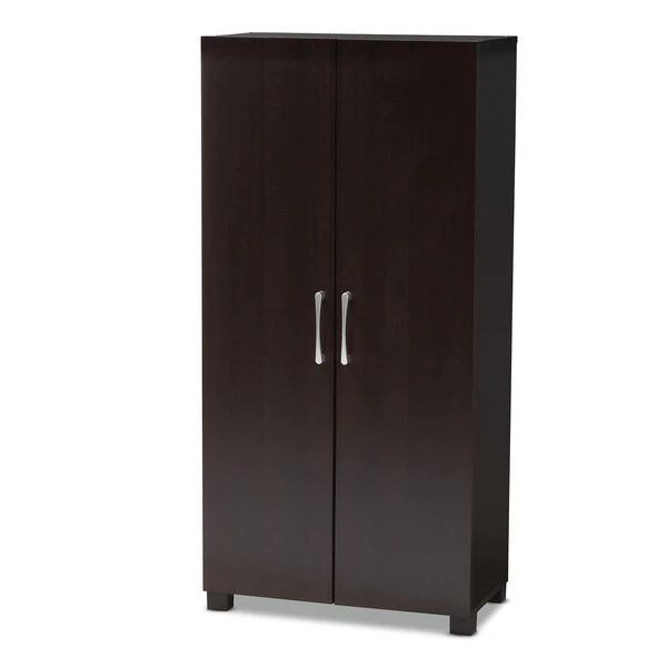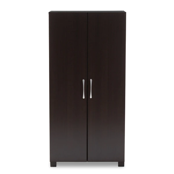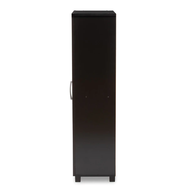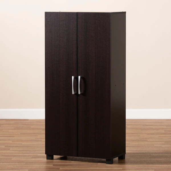 Stylish and compact, the Marine cabinet is the solution to efficient shoe storage. Constructed from engineered wood, the Marine showcases an elegant wenge dark brown finish. Two doors conceal six shelves with storage space for up to 12 pairs of shoes. Circular cut-outs on the back of the cabinet enable air circulation and prevent mold growth on your shoes. Silver PVC door handles and black PVC legs complete the look. The Marine cabinet requires assembly.