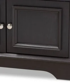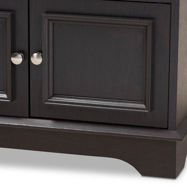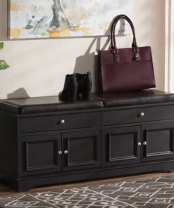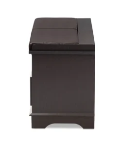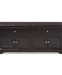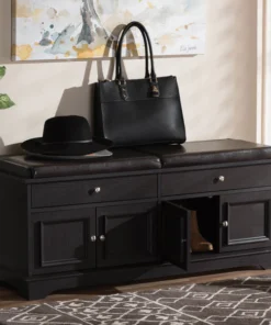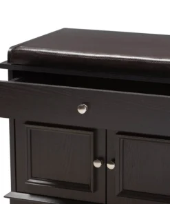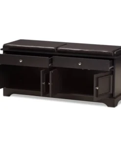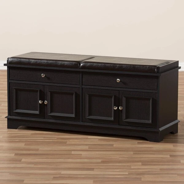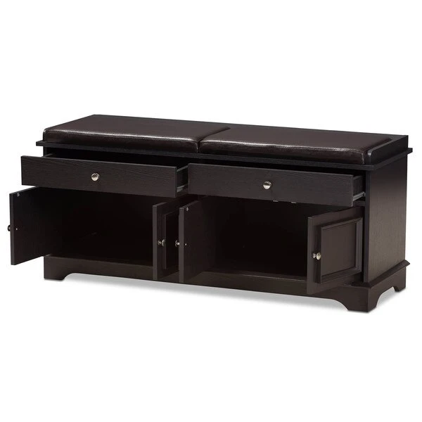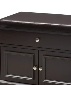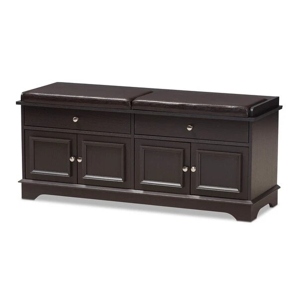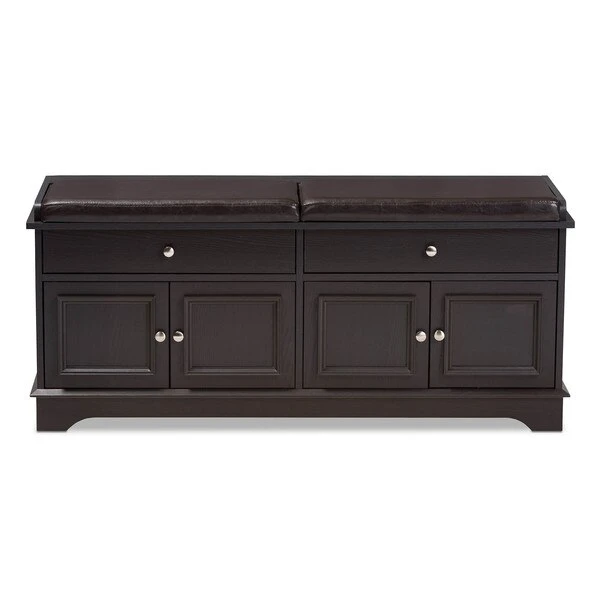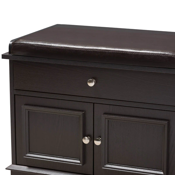 Give your home a cozy and inviting atmosphere with this upholstered shoe storage cabinet bench. Constructed of engineered wood in a dark brown finish, the storage bench will be an eye-catching piece, providing casual elegance that's great for just about any home decor style. The cabinets with doors reveal ample shelving spaces while the pull-out drawers provide additional storage capacity. Featuring picture frame moldings on the door panels, this shoe storage bench provides detailed style lines as well as practicality. To add functionality, the top is cushioned and upholstered in dark brown faux leather for your seating comfort. Silver accent hardware is in use for a modern look, allowing this piece of furniture to blend into the style of most households. The shoe storage bench requires assembly.