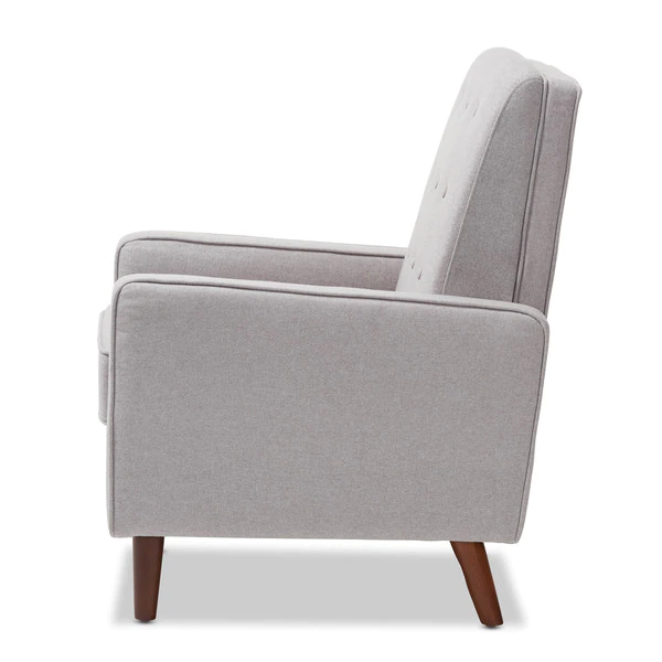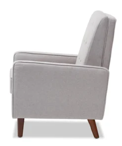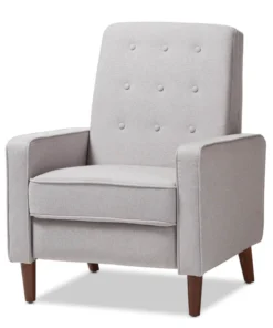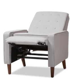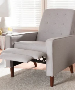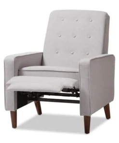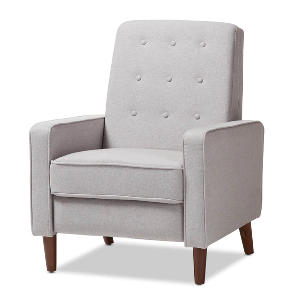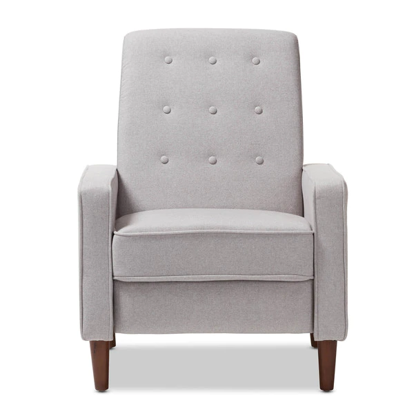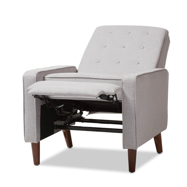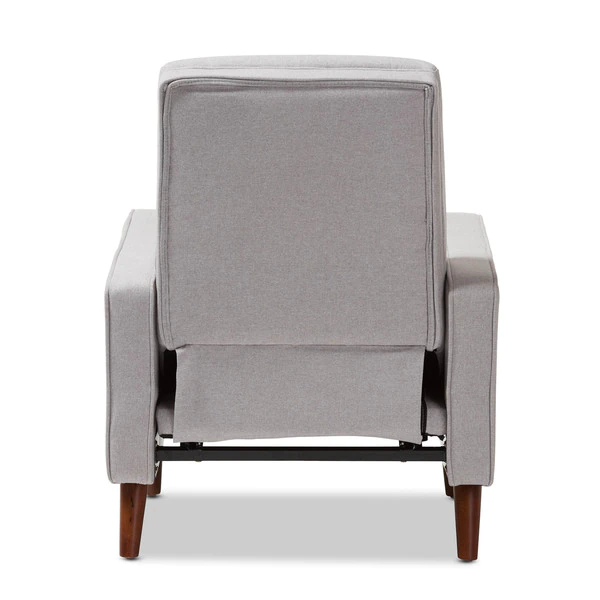 Sit back and relax in style with the Mathias recliner. The Mathias recliner's modern and contemporary-inspired look exemplifies the minimalist chic of modern design. Constructed with sturdy hardwood and plywood, this chair is built to last. Enjoy comfort with the chair's reclining back, raiseable footrest, and hidden steel push-back mechanism. The Mathias features light grey fabric, button-tufted upholstery over foam padding, making this a cozy addition to your living room, home office or entertainment room. Walnut-finished eucalyptus legs complete the sophisticated style of the Mathias. This recliner requires assembly.