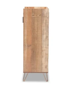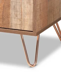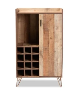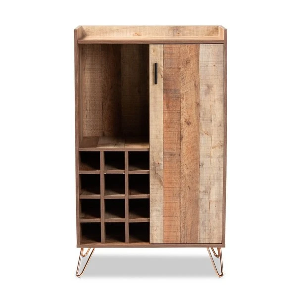 Display and store your wine collection in style with the Mathis wine cabinet. Made in Malaysia, this wooden cabinet features a rustic brown finish for a cool, modern look. Twelve individual wine cubbies provide space to store wine bottles. One open shelf and three internal shelves behind a door provide additional storage space. Requiring assembly, the cabinet is fitted with rose gold finished metal hairpin legs and a black door handle for a sleek, contemporary touch. An excellent storage option with modern style, the Mathis wine cabinet is ready to enhance the modern home.