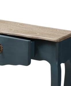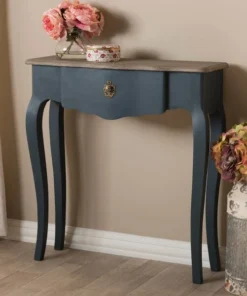 The lovely Mazarine console table will add a unique charm to your space. The classic and provincial-inspired design comes through in the greywashed table top and the graceful curves of the table's legs. The Mazarine's most stunning feature is its blue spruce finishing. The table's drawer face has a scalloped edge, evocative of farmhouse and French-style decor. The metal drawer knob of the Mazarine features an ornate design and gold finishing. Add elegance to your entryway or hallways with this breath-taking console table. The table requires assembly.