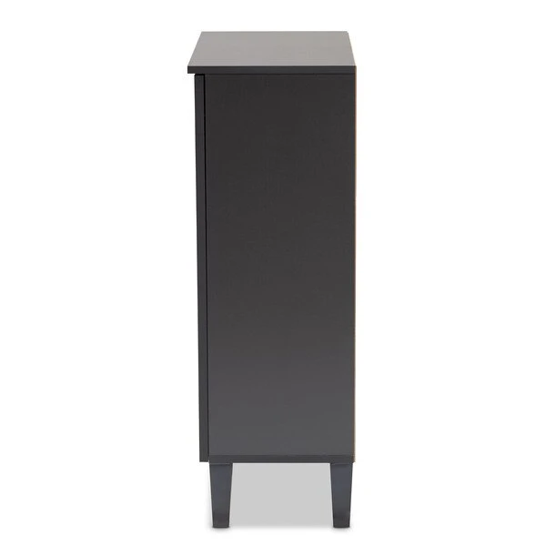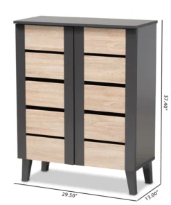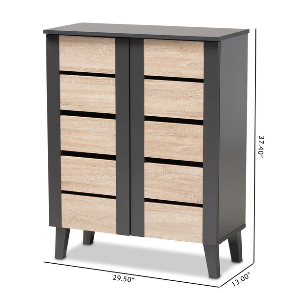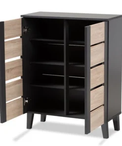 Stylish shoe organization is made easy with the Melle cabinet. Featuring a clean, contemporary design, this engineered wood cabinet features a chic two-tone oak and dark grey finish. Two doors conceal four shelves with storage space for up to 8 pairs of shoes. Slits are embedded within the doors to enable air circulation and prevent mold growth on your shoes. Angled legs add a cool, mid-century modern touch. The Melle cabinet requires assembly.