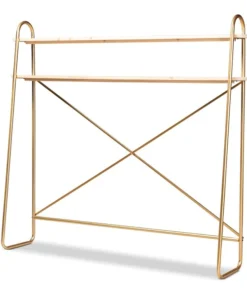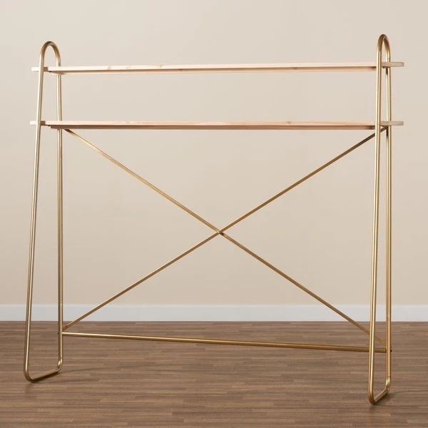 Add a dazzling and practical backdrop to your bedroom with the stunning Merida shelf. Made in China, the Merida is comprised of a brushed gold finished metal frame fitted with natural brown finished wood. Two shelves provide space to display decorations and provide convenient storage. Requiring assembly, the Merida features crisscross support bars for excellent stability, as well as a sleek, contemporary look. An alluring piece that transforms any bedroom, the Merida shelf is a superb addition to any space.