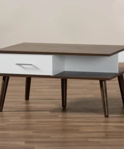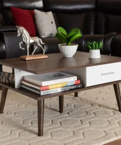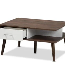 Form meets function in the Merlin coffee table. Drawers on either side provide storage for remotes, manuals, and more. Open shelves provide display space for your favorite books and magazines. Its two-tone walnut and white finish lends a cool retro look, while angled legs create a chic profile. The Merlin coffee table requires assembly.