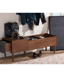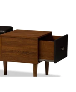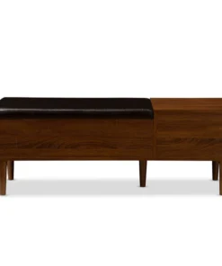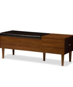 Dual-purposed and versatile, this bench is a great addition to your foyer, mudroom, utility room or bedroom. Featuring retro modern style, the Merrick is constructed of engineered wood and finished in two-tone finishing, oak and espresso brown. The dark brown faux leather cushion provides a comfortable seating area and ample storage space when it is lifted open. The drawer on the right provides extra storage space for your hats, keys, gloves and scarfs. Silver hardware is in use to add modern tone. Shapely legs featuring mid-century style are constructed of solid rubberwood, supporting the seating storage bench. The Merrick requires assembly.