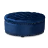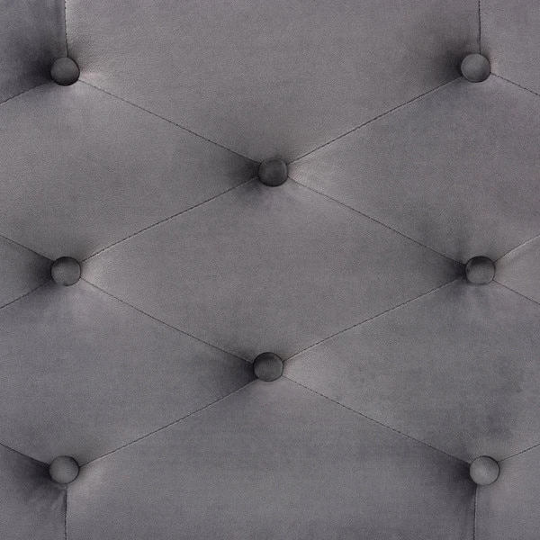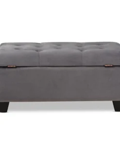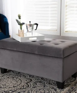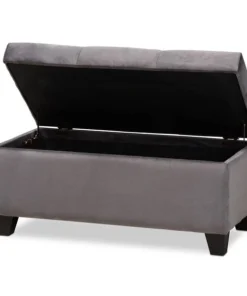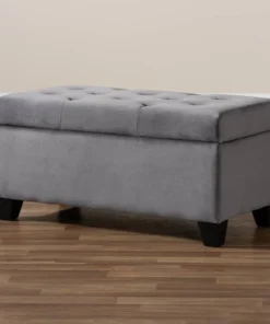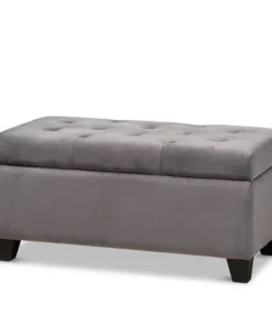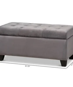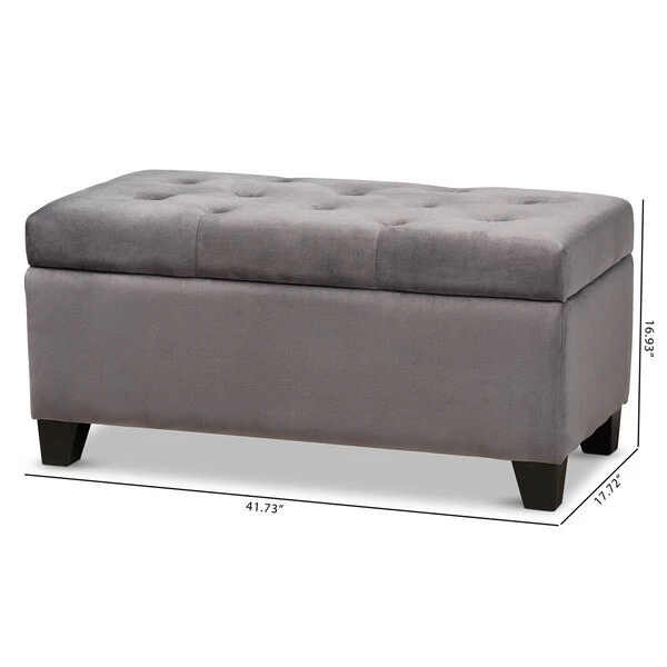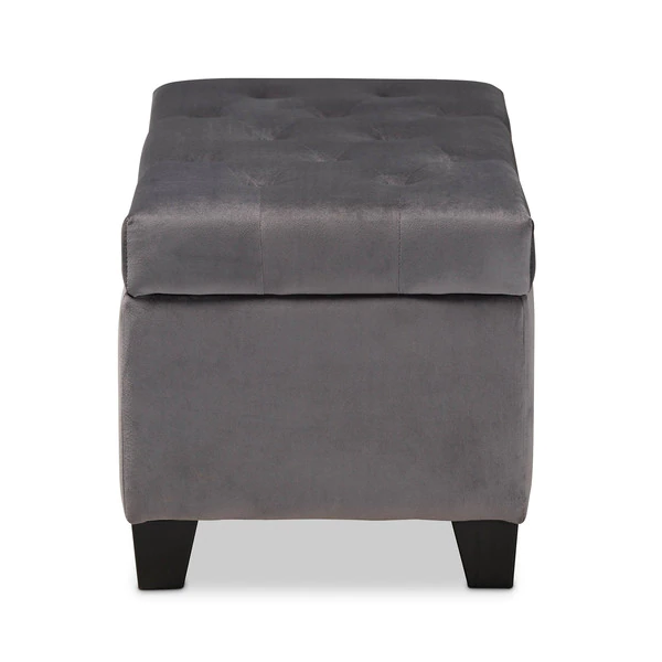 Cute, sturdy, and practical, the Michaela storage ottoman can meet a wide range of your organization needs. The modern and contemporary-inspired design emphasizes a simple silhouette and luxurious texture. The ottoman is upholstered in a rich velvet fabric, with a foam-padded, button-tufted lid. Ample storage space is located beneath the lid, made secure with a spring hinge. Black wooden feet complete the look. Use this ottoman as a decorative piece at the edge of a bed, as storage in the guest room, or as storage for shoes and toys in your entryway. The Michaela storage ottoman requires assembly.