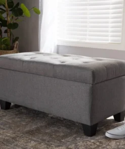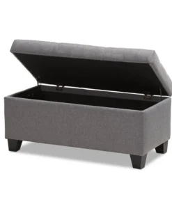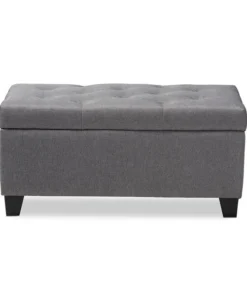 Cute, sturdy, and practical, the Michaela storage ottoman can meet a wide range of your organization needs. The modern and contemporary-inspired design emphasizes simplicity and neutral colors. The Michaela is upholstered in a pleasant grey fabric, with a foam-padded, button-tufted lid. The ottoman features a storage compartment under the lid, made secure with a spring hinge. The Michaela has black finished wood feet, and can fit easily in many areas. Use this storage ottoman at the edge of a bed, as storage in the guest room, a place for shoes or toys in your entryway – wherever needs to be more tidy! The Michaela requires minimal assembly – all you need to do is attach the feet.