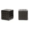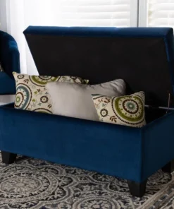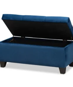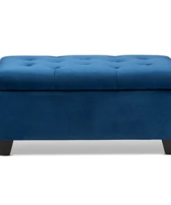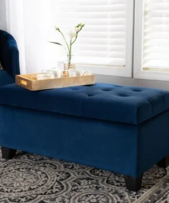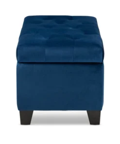 Cute, sturdy, and practical, the Michaela storage ottoman can meet a wide range of your organization needs. The modern and contemporary-inspired design emphasizes a simple silhouette and luxurious texture. The ottoman is upholstered in a rich velvet fabric, with a foam-padded, button-tufted lid. Ample storage space is located beneath the lid, made secure with a spring hinge. Black wooden feet complete the look. Use this ottoman as a decorative piece at the edge of a bed, as storage in the guest room, or as storage for shoes and toys in your entryway. The Michaela storage ottoman requires assembly.