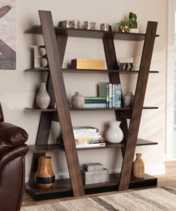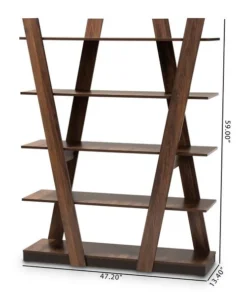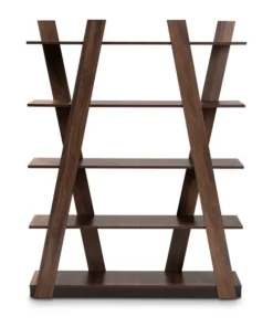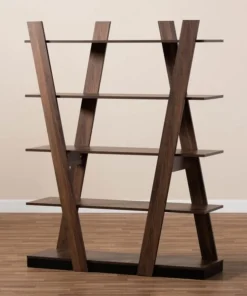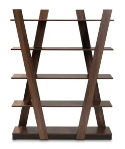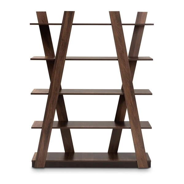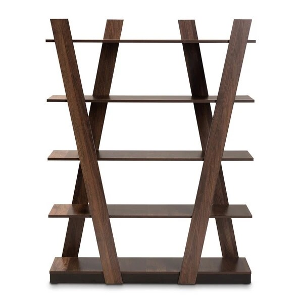 Organize your book collection with the eye-catching Michio shelf. This wooden shelf features a sleek walnut brown finish that complements any interior aesthetic. Five spacious shelves provide ample space to display your favorite books and trinkets. Long, angled panels create a visually striking display. Requiring assembly, the Michio is well suited for both a living room or home office setting.