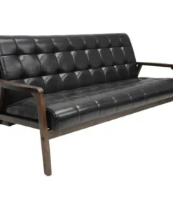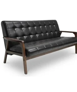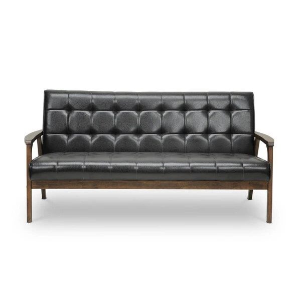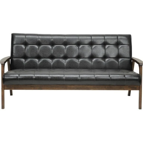 Declare your allegiance to timelessness with our Mid-Century Masterpieces Sofa. Inspired by mid-century style, our modern sofa nods to the past with a foot firmly entrenched in the present. Medium brown wood veneer finish and a brown faux leather foam-cushioned seat seamlessly combine comfort and style.
