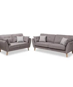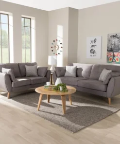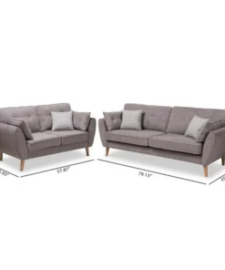Modern looks never looked so welcoming – sink into the Miranda 2-piece living room set. The mid-century modern-inspired design is clear to see in the clean lines and low-profile of the set. The Miranda is upholstered in light grey fabric and rests on smoothly tapered light brown legs. The two-piece set features button-tufting on the seat back cushions and delightful piping on almost every visible edge. The Miranda comes with four side pillows and three decorative pillows, and removable cushions for ease of cleaning. It's easy to imagine getting cozy and comfortable on the generously foam-padded Miranda sofa and loveseat. This set will bring extra charm to your living room or other shared space. The Miranda requires assembly.